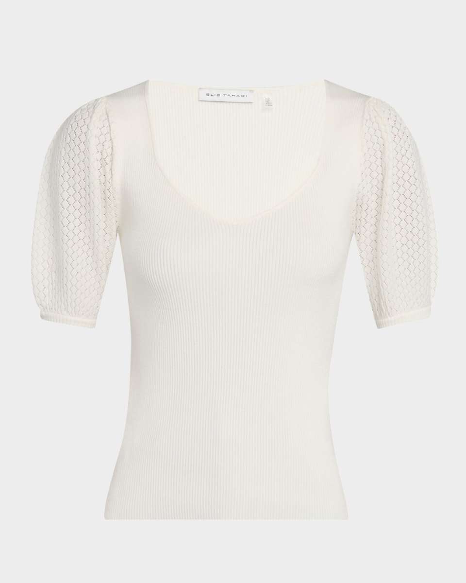 Elie Tahari "The Piper" ribbed sweater with pointelleknit sleeves Approx. 23"L from shoulders to hem Scoop neckline Short puff sleeves Slim fit Pullover style Viscose/polyester/nylon/polyamide Unlined Hand wash or dry clean Imported