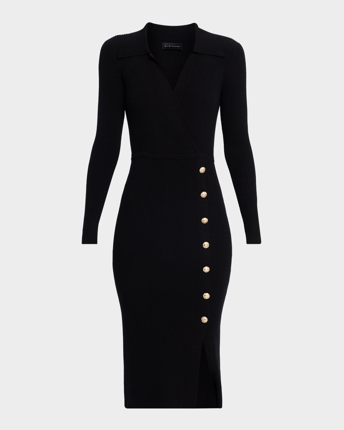 Elie Tahari knit dress embellished with a sultry slit and goldtone buttons along the placket Approx. 45.5"L from shoulders to hem Polo collar Long sleeves; approx. 24.0"L Faux wrap bodice Hem falls below the knee Slit Length (inches): 7 Bodyconscious silhouette Slipover style Viscose/polyester Lining: Polyester Hand wash Imported