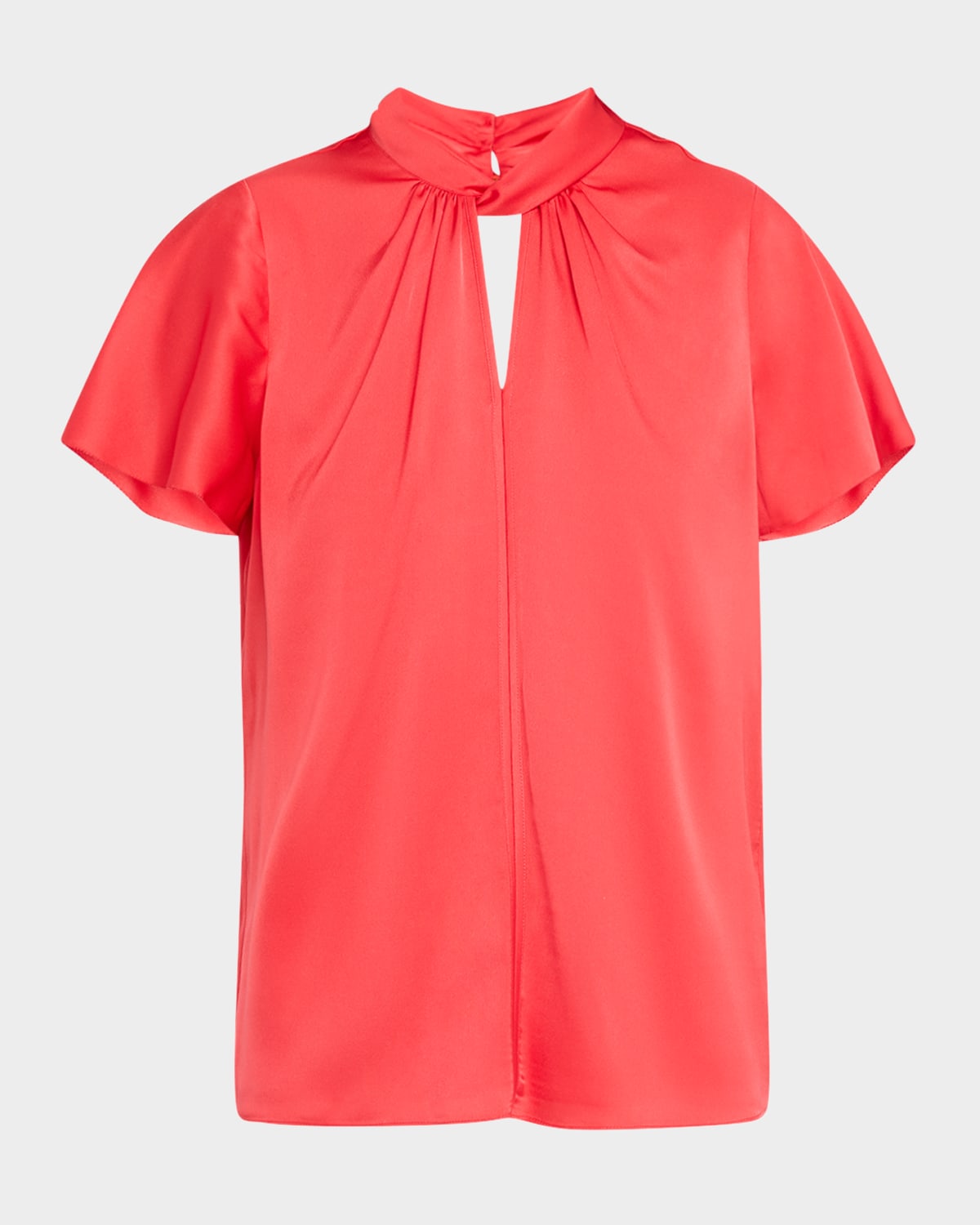 Elie Tahari "The Rina" cutout blouse features a delicate twist knot and ruched details Approx. 26"L from shoulders to hem High neckline Short sleeves; approx. 7.5"L Relaxed fit Keyhole button back Pullover style Silk/spandex Lining: Viscose Dry clean Imported