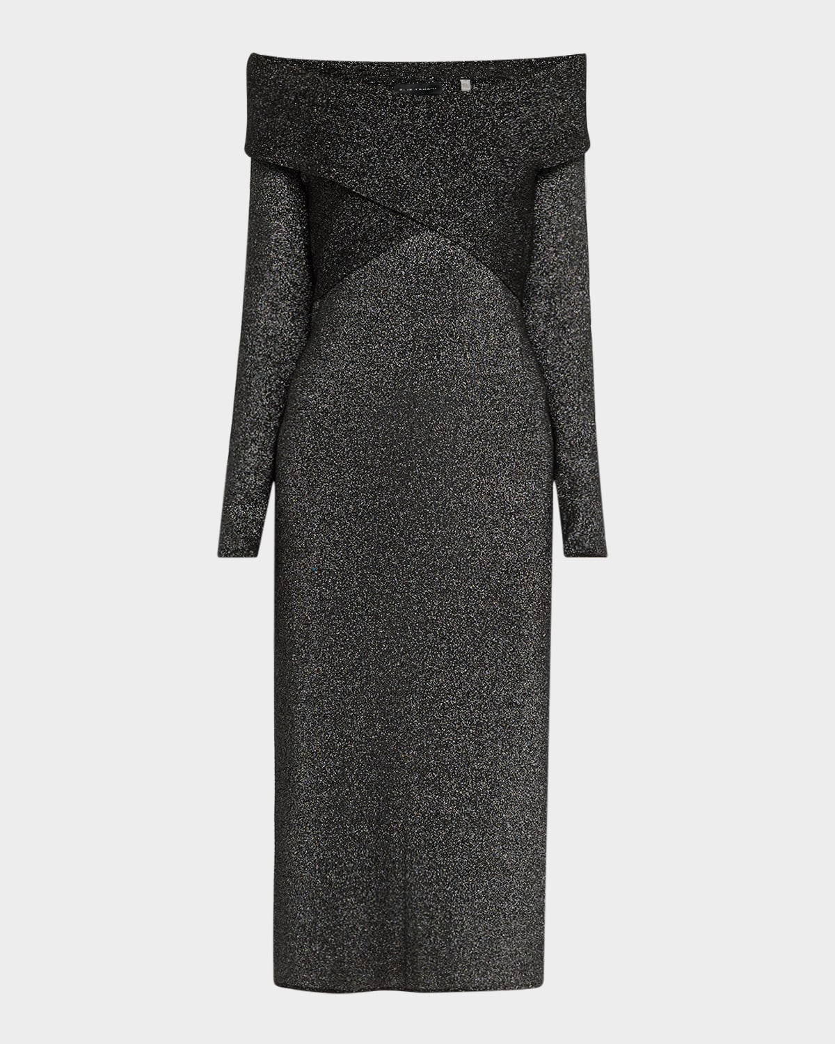 Elie Tahari "Rowan" Lurex® colorblock knit sweater dress featuring a crossover bodice Approx. 45"L from shoulder to hem V neckline Long sleeves; approx. 29.3"L Hem falls below the knee Sheath silhouette Invisible back zip closure Viscose/nylon/polyamide/polyester Unlined Hand wash or dry clean Imported