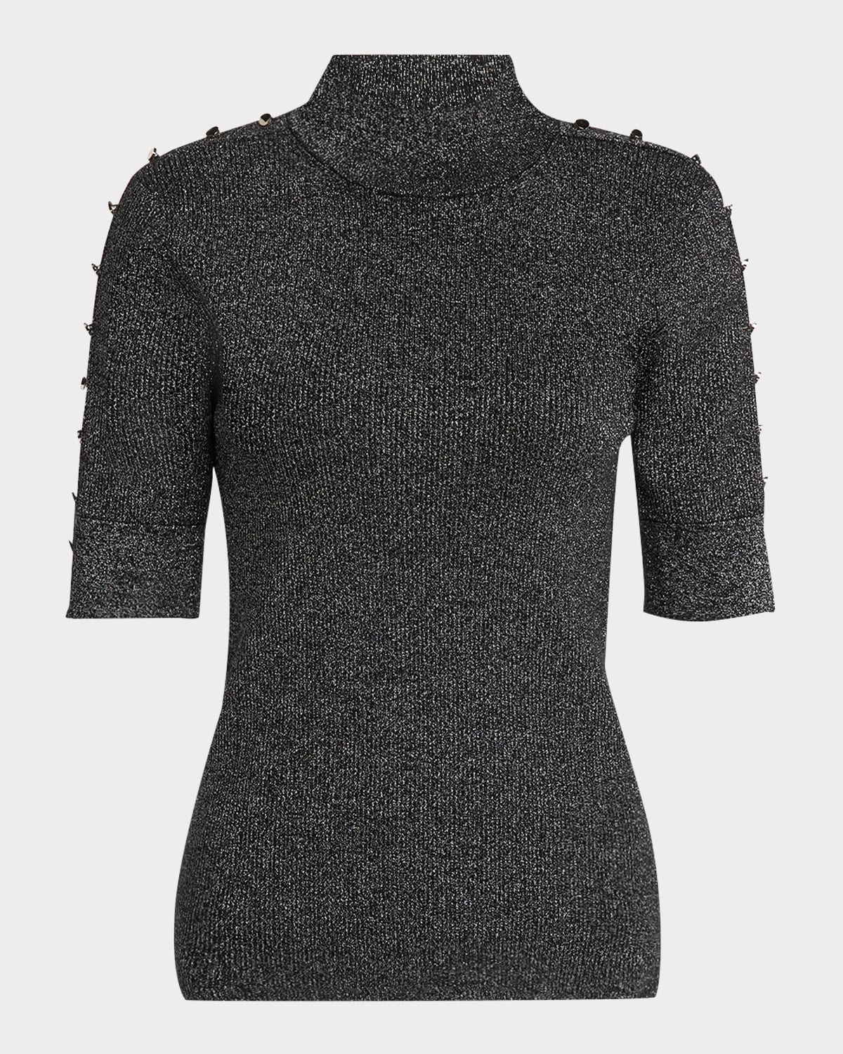 Elie Tahari "Samantha" metallic knit sweater outlined by silvertone hardware Approx. 24"L from shoulder to hem Mock neckline Short sleeves; approx. 10.8"L Cropped length Slim fit Pullover style Viscose/nylon/polyamide/polyester Unlined Hand wash or dry clean Imported