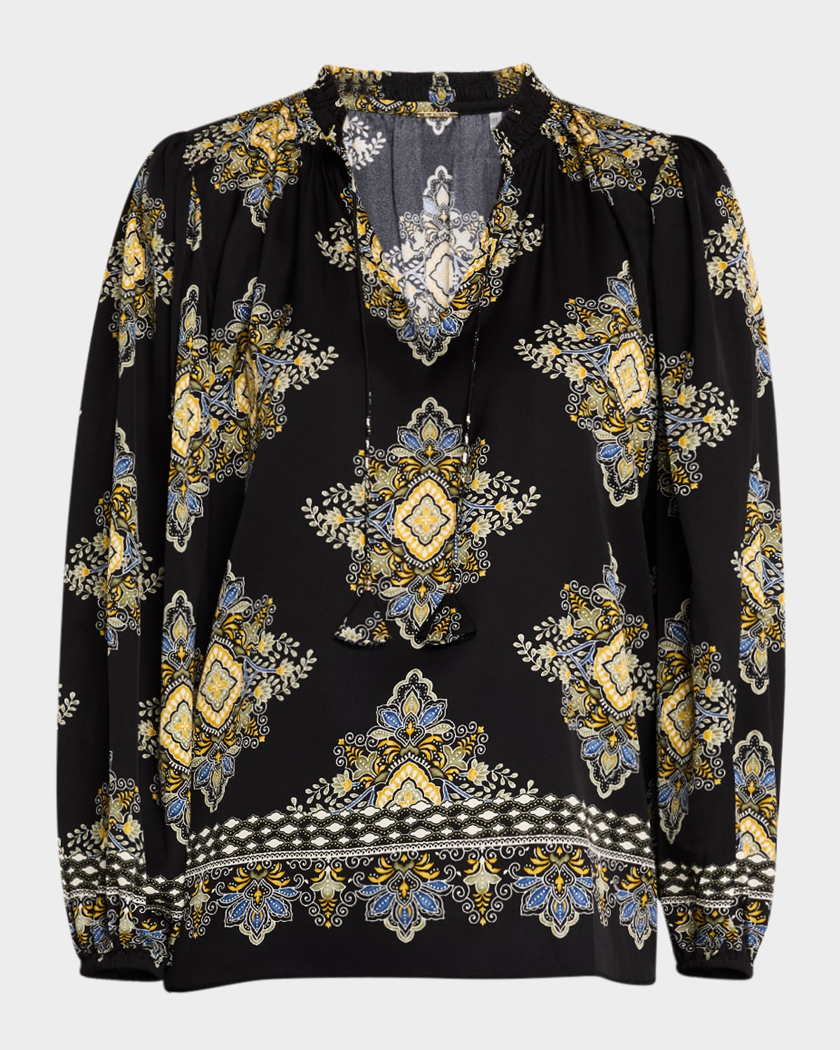 Elie Tahari "The Tani" blouse in Marseille silk features a floral medallion print Approx. 26.5"L from shoulders to hem V neckline; neck selftie Long sleeves; approx. 24.5"L Relaxed fit Pullover style Silk/spandex Unlined Dry clean Imported
