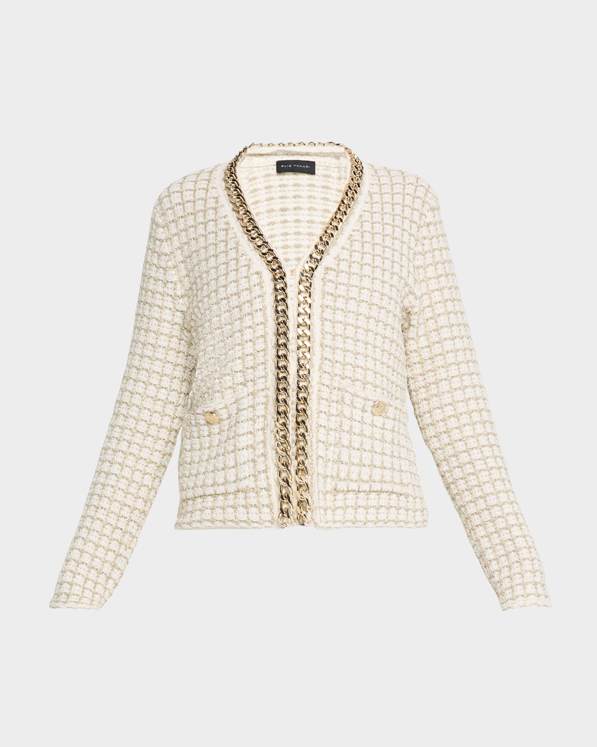 Elie Tahari "Trista" embellished tweed cardigan outlined by a goldtone chain Approx. 21"L from shoulder to hem V neckline; fish hook closure Long sleeves with button cuffs; approx. 23.8"L Front patch pockets Hip length Slim fit Wool/nylon/polyamide/cotton Unlined Dry clean Trim: Metal Imported
