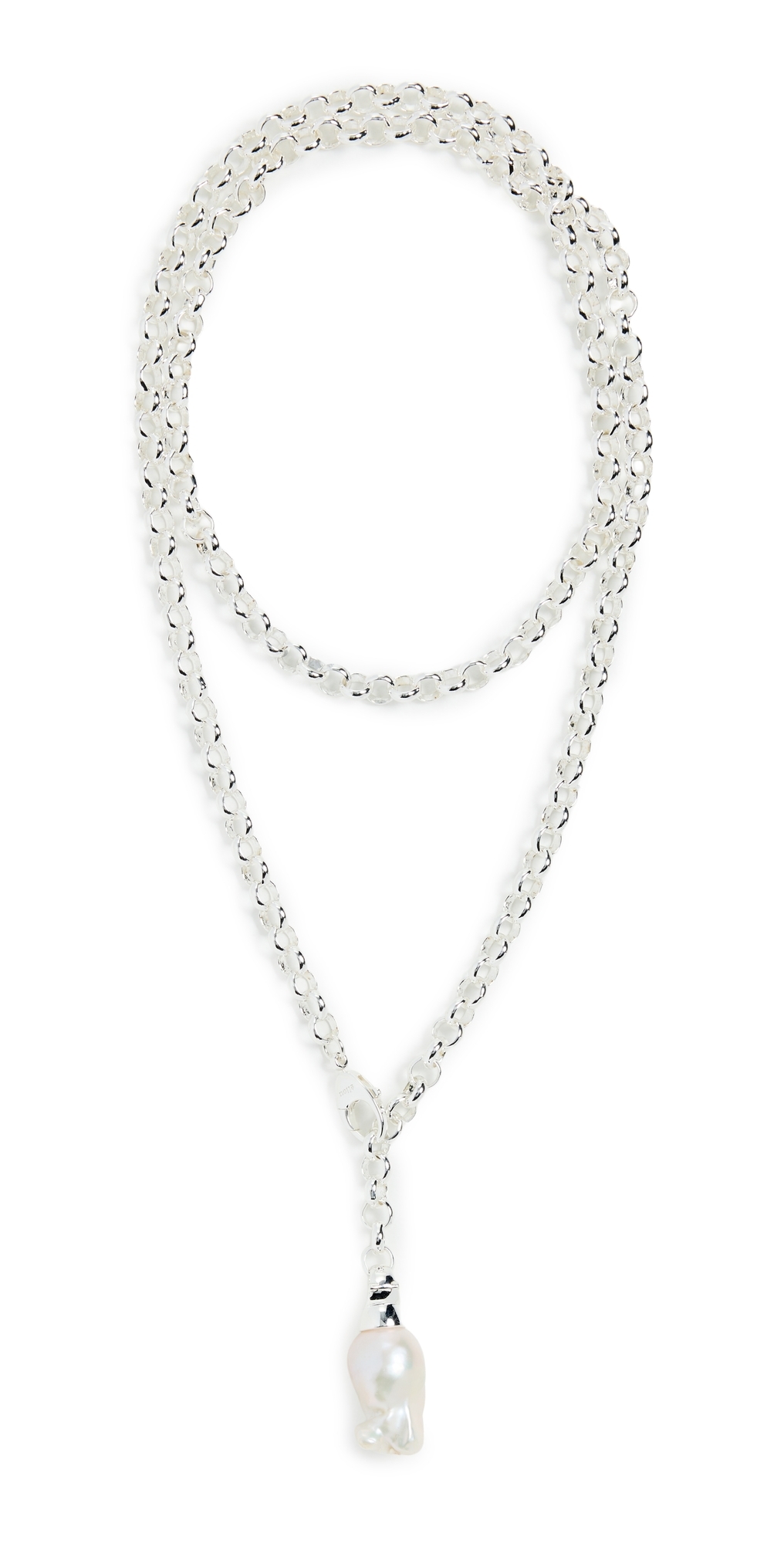 Adjustable chunky chain. Polished finish. Freshwater cultured pearl. Silver plated brass. Lobster claw clasp. Made in the USA.