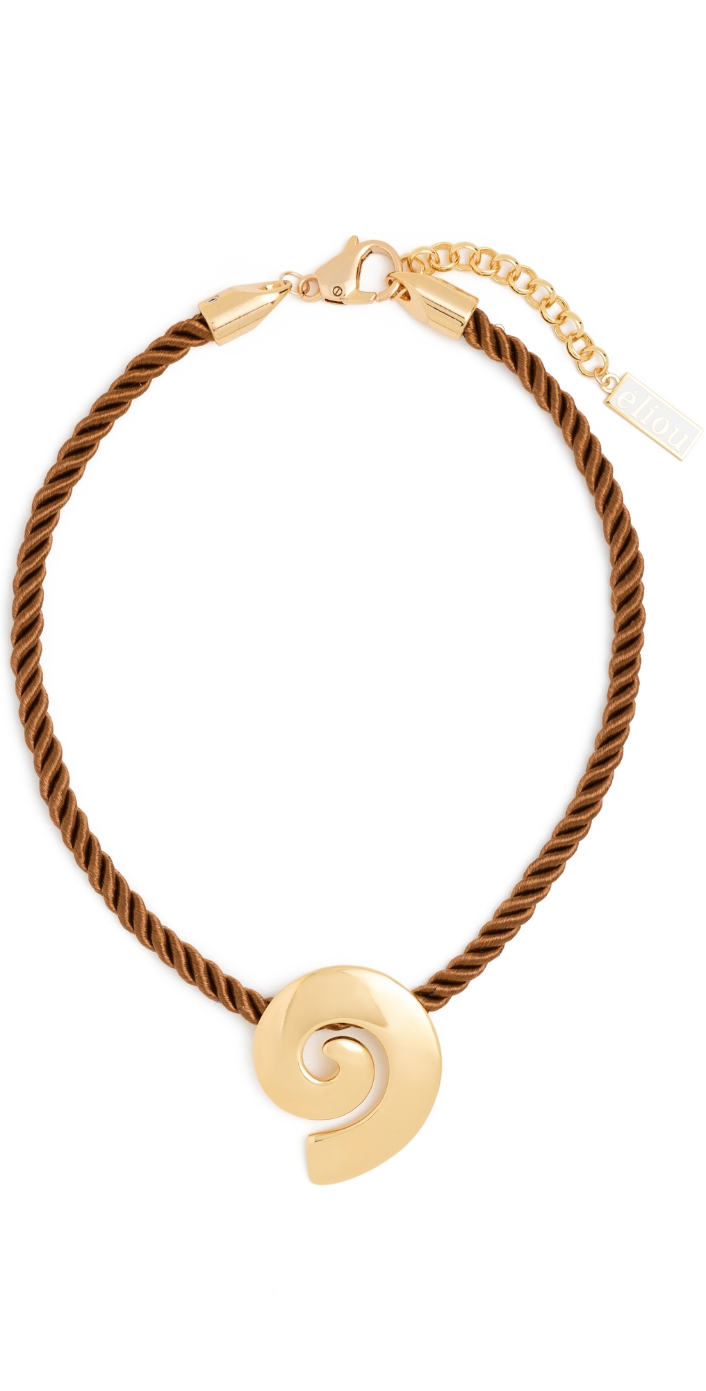 Spiral motif pendant. Twisted nylon cord. 14k gold plated brass. Lobster claw clasp. Made in the USA. Measurements: Length: 15.75-17.75in / 40.0-45.0cm