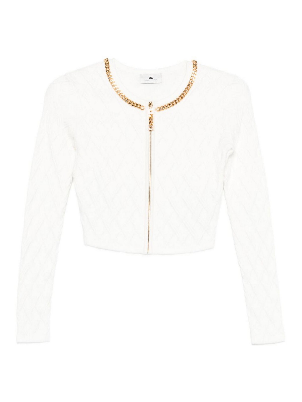 Fermeture zippée à motif losange blanc ivoire, manches longues, bordure en chaîne dorée, longueur raccourcie