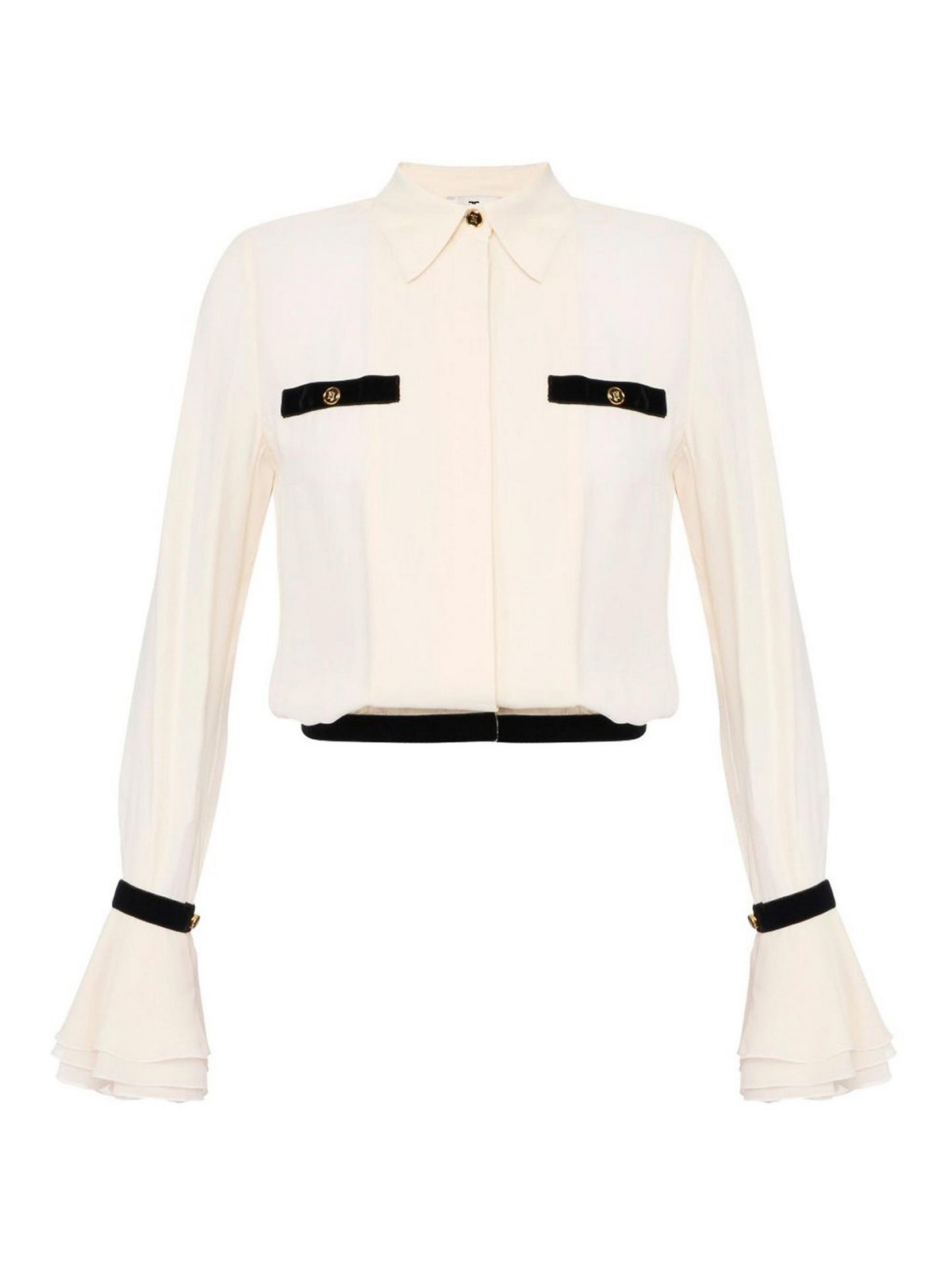 Boutons ornés de bijoux, blanc cassé, poignets volantés, manches longues, col classique