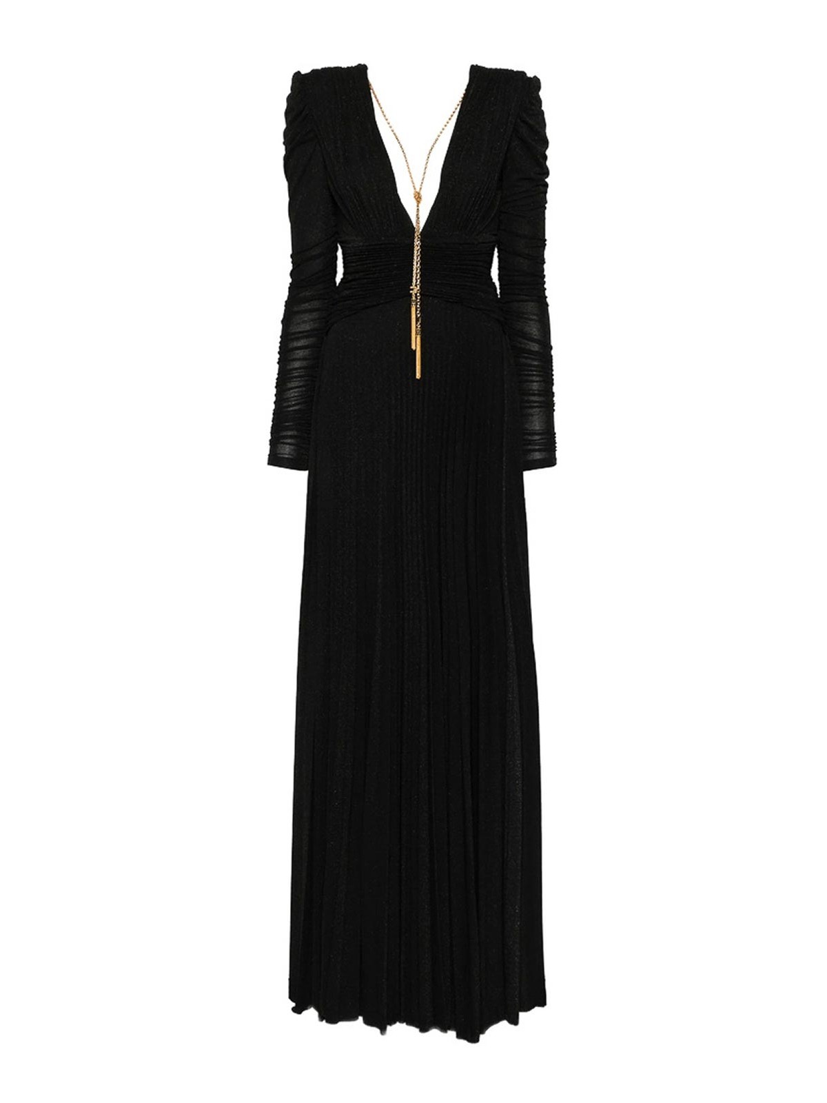 Jupe plissée noire en V, col en V, manches longues, ornement en chaîne ton sur ton