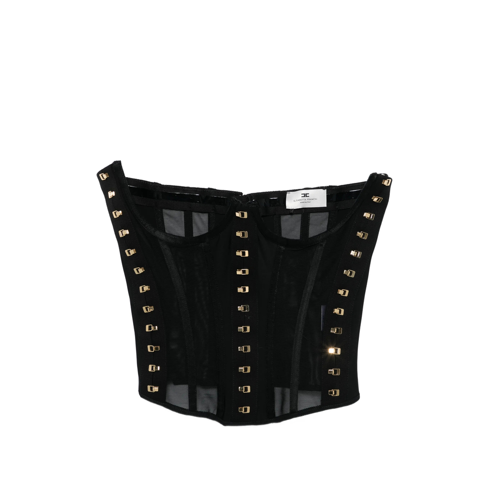 black metal embellishments square neck sleeveless boned bodice mesh details