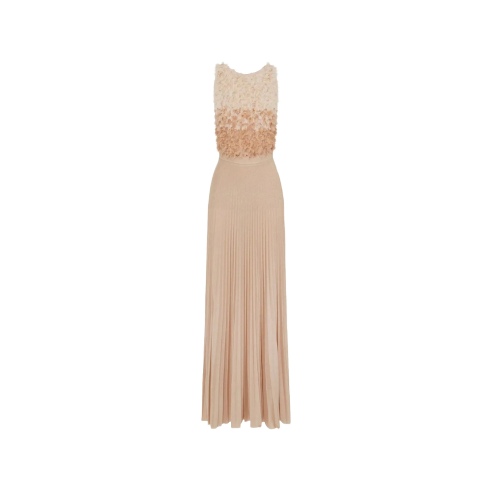 beige floral appliqué pleated skirt sleeveless back zip fastening