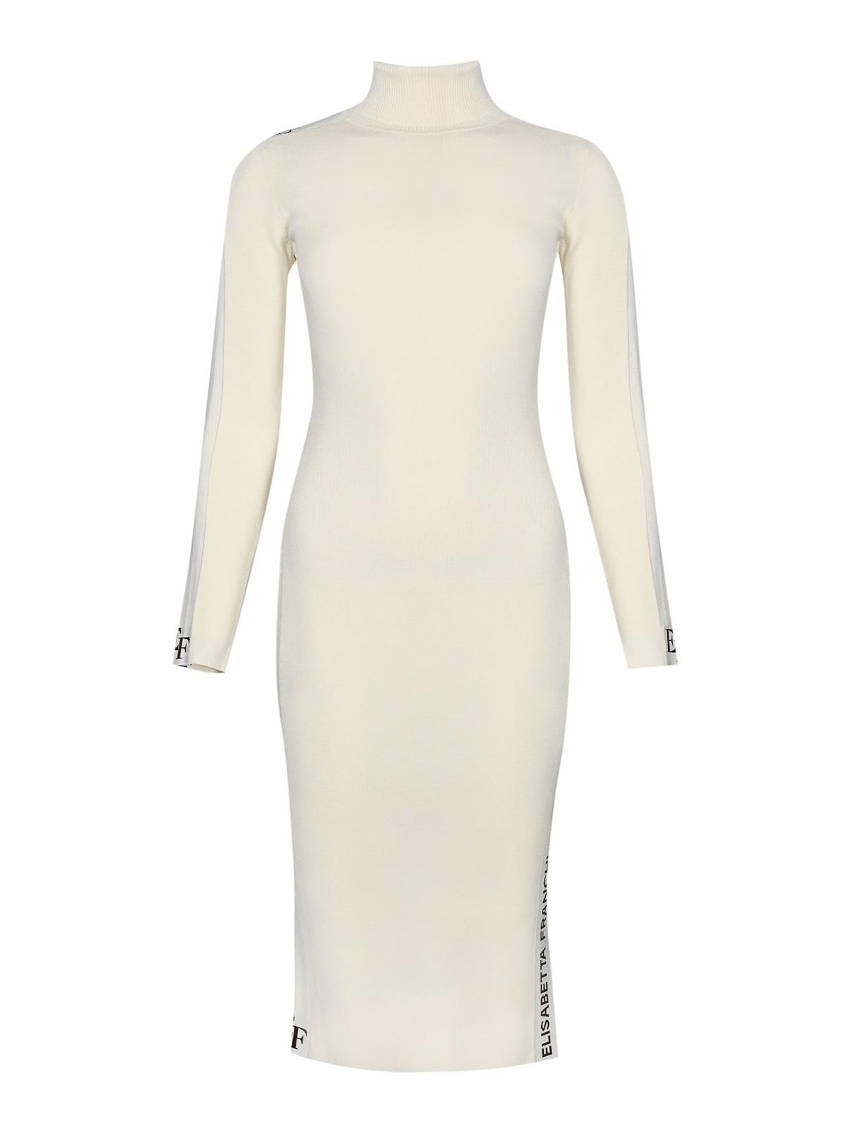 Tricot brillant, tricot côtelé, rayures à logo contrastées, col haut, manches longues, fente latérale, coupe ajustée