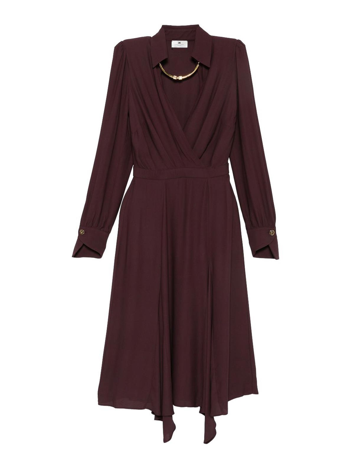 Encolure cache-caur bordeaux, manches longues, poignets boutonnés, ourlet évasé, forme trapèze