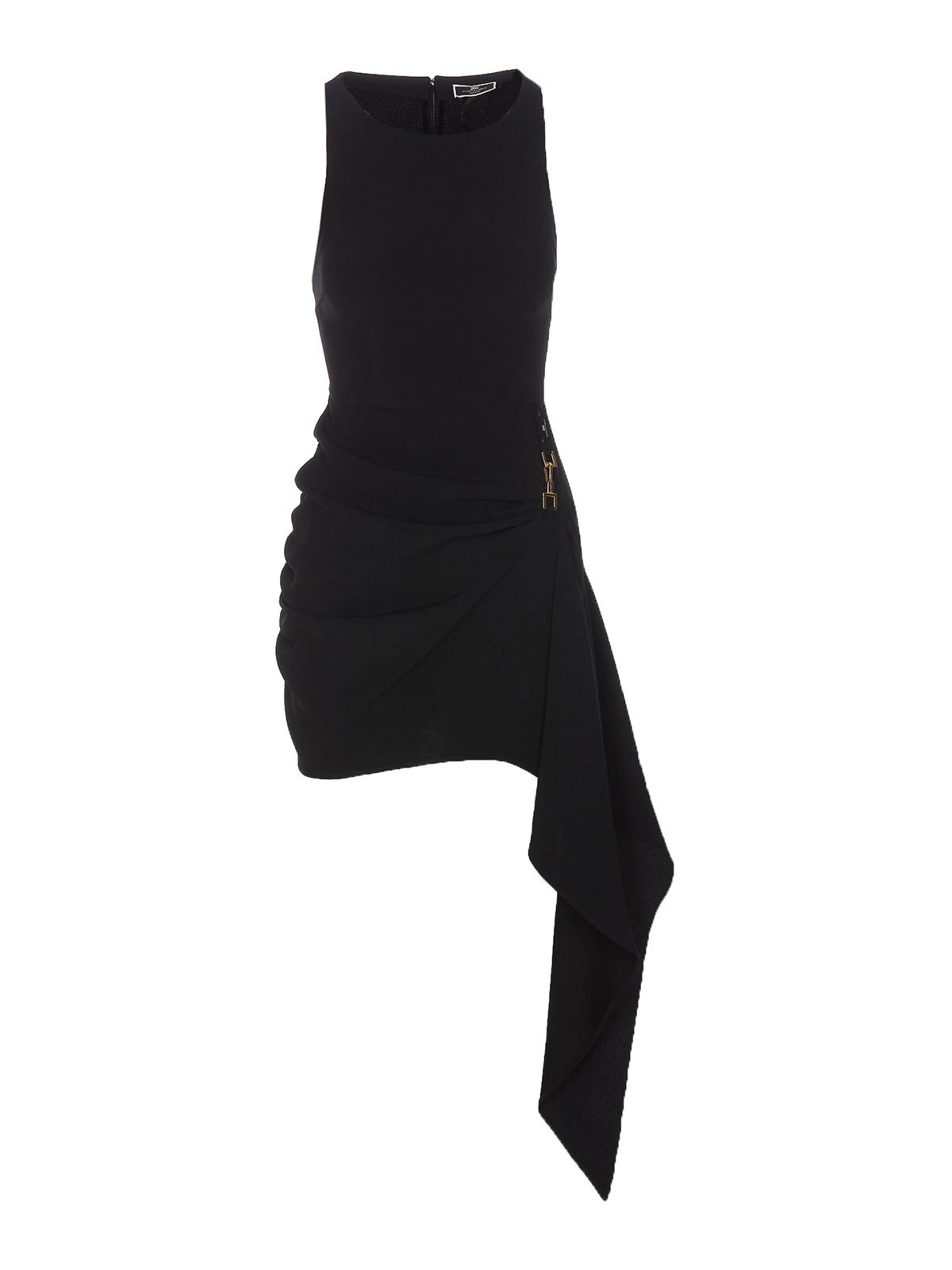 Robe noire Elisabetta Franchi, fermeture éclair et crochet dans le dos, sans manches, asymétrique en bas, plaque logo sur le mini-modèle