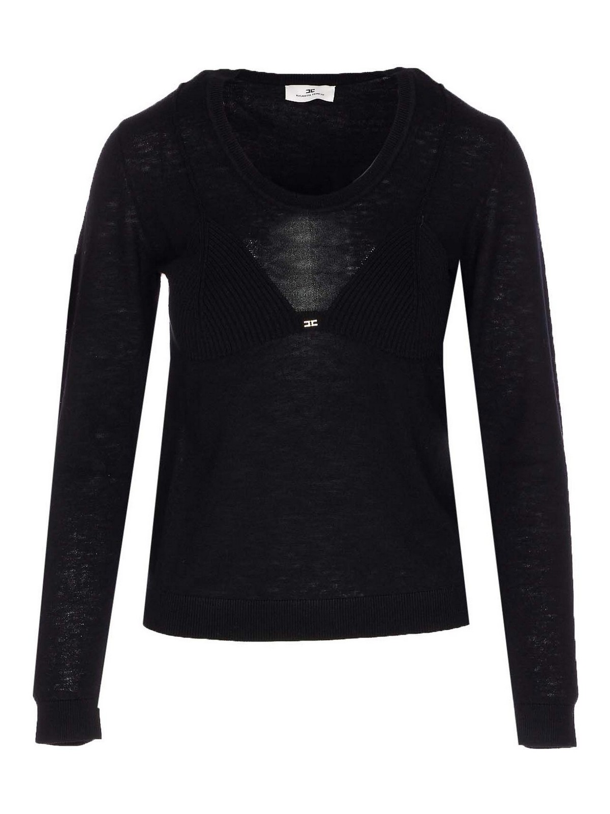 Top à manches longues noir Elisabetta Franchi, col rond, manches longues, mini-plaque, logo sur le nom de la créatrice, couleur: noir