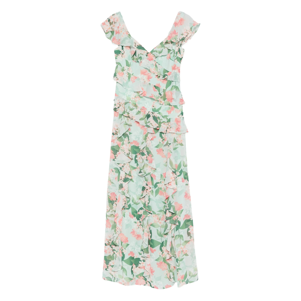 mint green floral print V-neck tiered ruffles sleeveless concealed back zip fastening