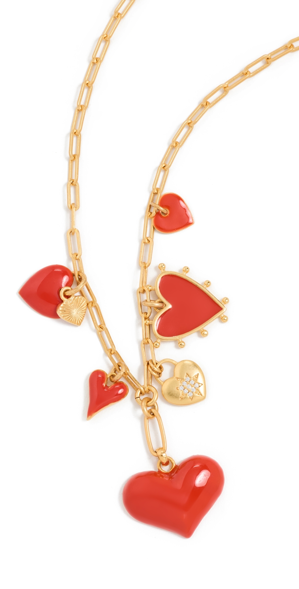 Heart charms with enamel coating. 24k gold plated brass. Lobster claw clasp. Made in the USA. Measurements: Length: 18.5in / 47.0cm