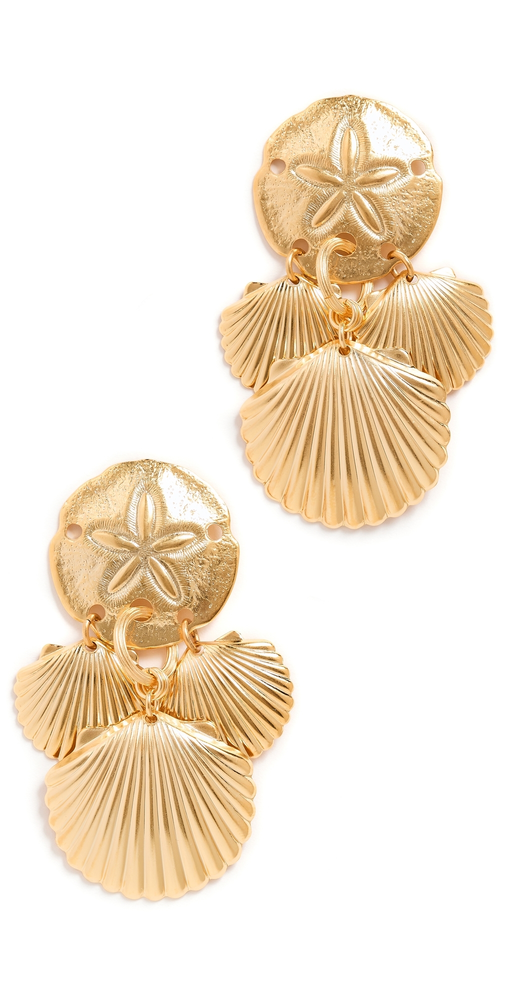 Sand dollar and seashell design. 24k gold plated brass. Post closure. Made in the USA. Measurements: Width: 1.5in / 4cm Length: 2.25in / 6cm
