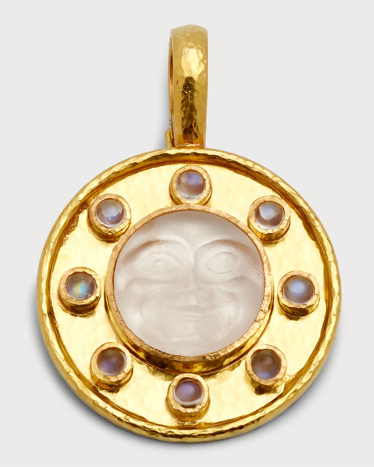 Elizabeth Locke enhancer Approx. 1.1" diameter (28mm) Signature 19karat yellow gold Eight 3mm cabochon moonstones Round crystal Venetian glass intaglio Flat hammered bezel Necklace sold separately 13mm hinged bale Style # P84591P Imported