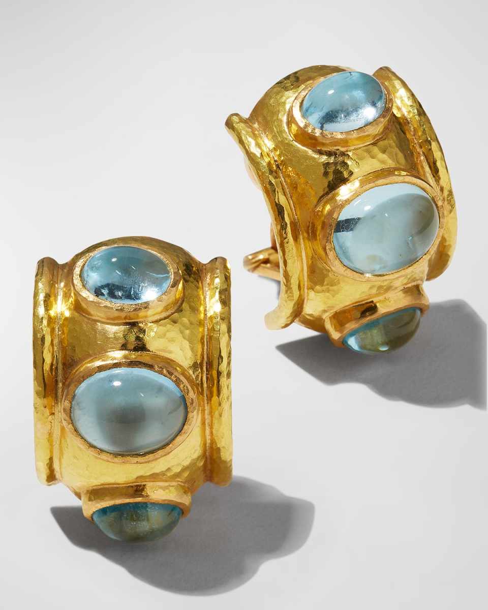 Hoop earrings by Elizabeth Locke Earrings, approx. 1"H x 0.5"W 19karat yellow gold with handhammered finish Bezelset oval aquamarine cabochons, 7.67 total carat weight Omega backs with folddown post for clip or pierced option Imported