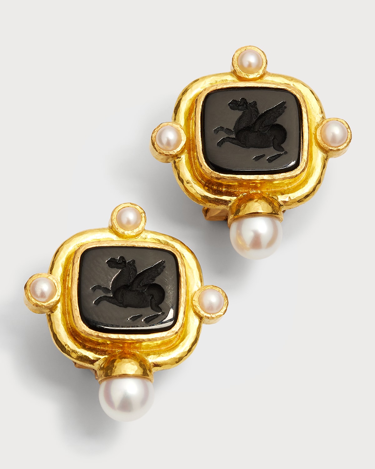 Elizabeth Locke earrings Approx. 24mm x 22mm total Hammered 19karat yellow gold 3mm and 6mm naturallyhued freshwater cultured pearls Features black 'square pegasus' horizontal cushion Venetian glass intaglios backed with motherofpearl Omega backs with folddown posts Can be worn clip or post back Imported