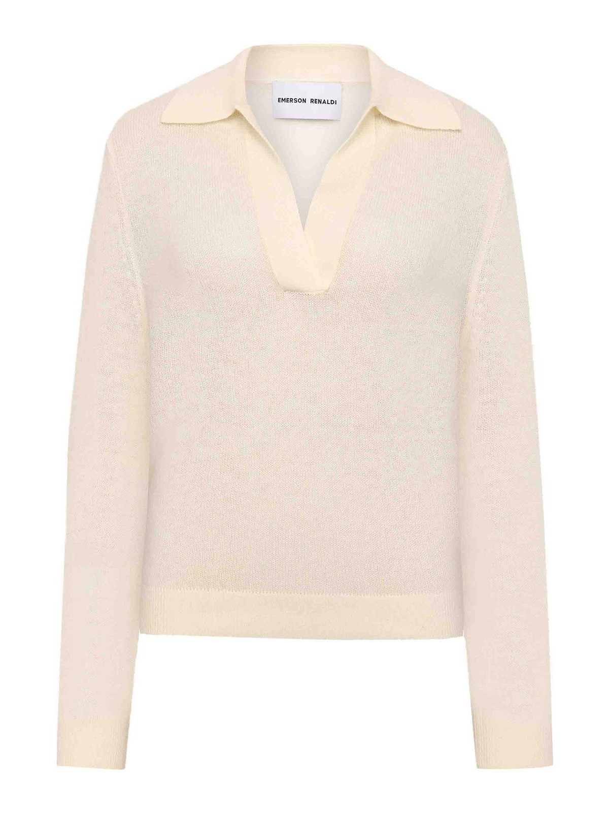 Investissez dans une élégance intemporelle et un confort ultime avec le pull en cachemire, le complément parfait à votre garde-robe. La matière en cachemire confère au pull une texture douce et luxueuse agréable au toucher., couleur du créateur: blanc cassé, cachemire, col polo profond, manches longues, ourlet droit.