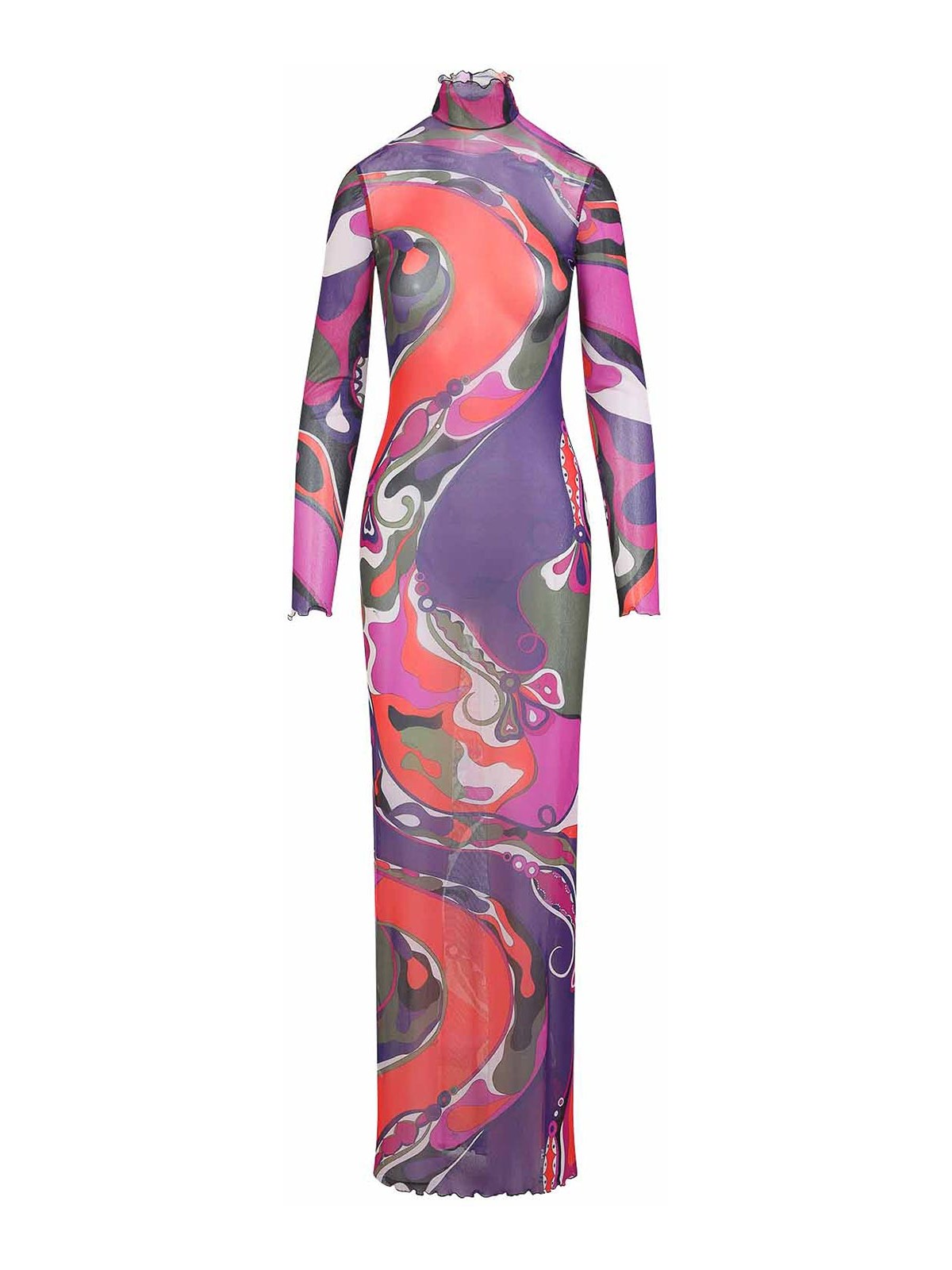 Robe longue multicolore en tulle Pucci confectionnée à partir d'un imprimé signature en maille multicolore, col montant, manches longues, coupe ajustée, longueur de la cheville, bords volantés