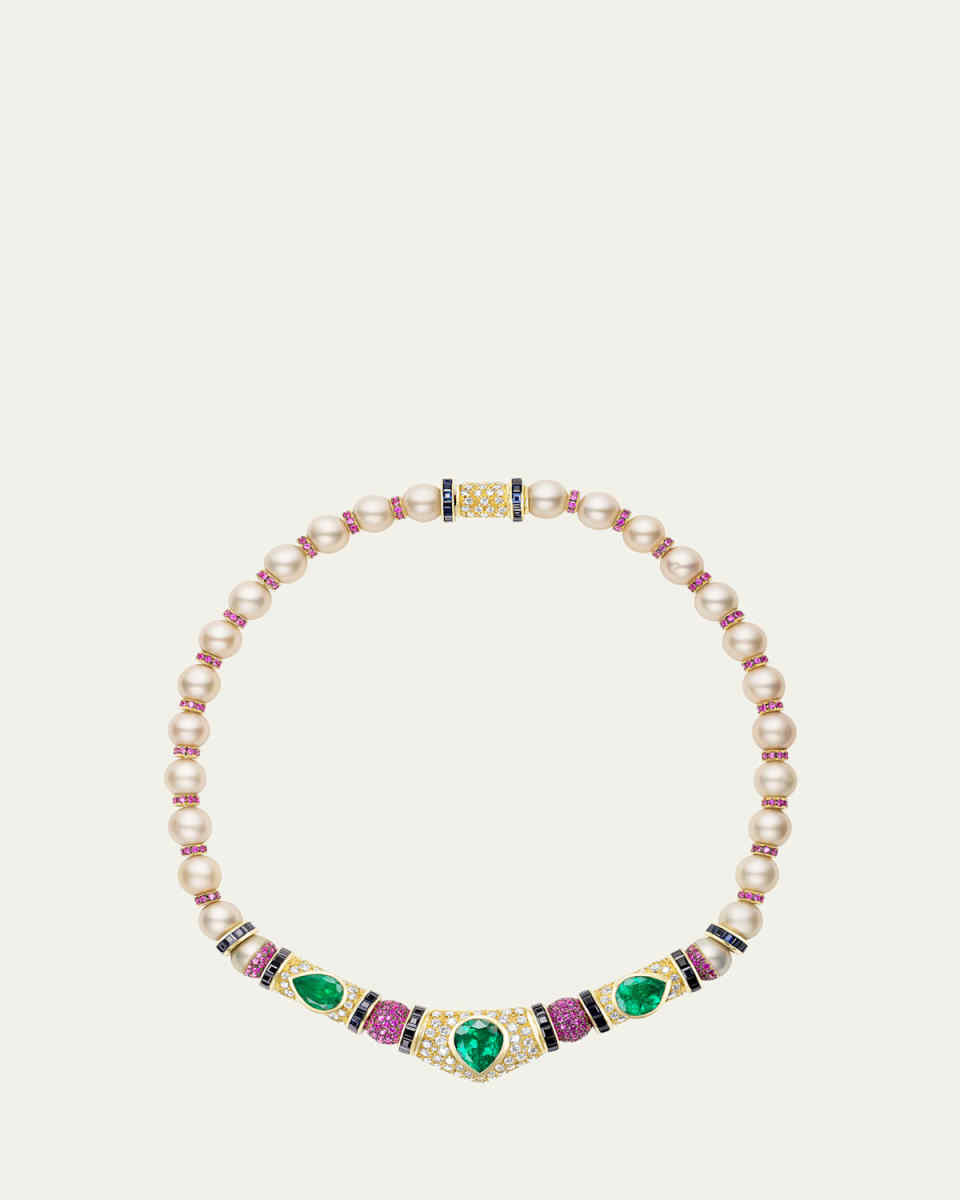 18K Yellow Gold Re-Worked Vintage Necklace with Pearls, Diamonds, Emeralds and Sapphires