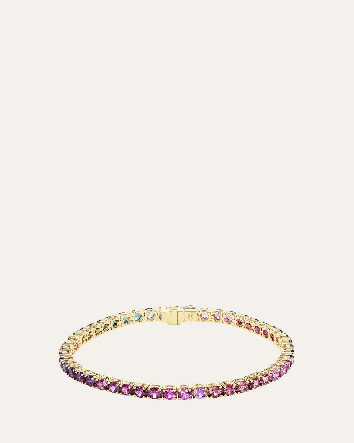 Emily P. Wheeler tennis bracelet Polished 18karat yellow gold Prongset round gemstones 1.71 total sapphire carat weight 1.25 total topaz carat weight 0.90 total tourmaline carat weight 1.70 total rhodolite carat weight 2.38 total amethyst carat weight Box clasp Made in USA