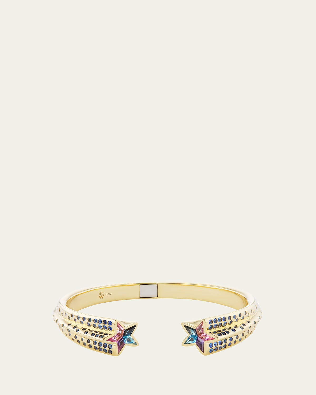 Colorful stones are combined to create starshaped endcaps for this Emily P. Wheeler bracelet. Each end of the cuff is reminiscent of a shooting star, thanks to the flushset stones arranged in a graduating pattern. Polished 18karat yellow gold 1.81 total sapphire carat weight 0.77 total topaz carat weight 0.61 total tourmaline carat weight 0.28 total amethyst carat weight Hinged opening eases dress Made in USA