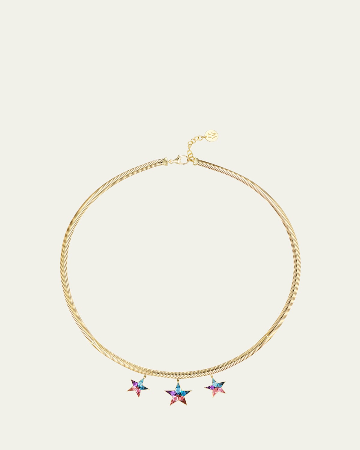 Colorful stones are combined to create starshaped charms for this Emily P. Wheeler necklace. Pink tourmaline, amethyst, Swiss blue topaz, and London blue topaz delicately hang from the flexible snake chain. Necklace length: approx. 16.5 inches Polished 18karat yellow gold 1.16 total topaz carat weight 1.03 total tourmaline carat weight 0.48 total amethyst carat weight Adjustable length Lobster clasp Made in USA