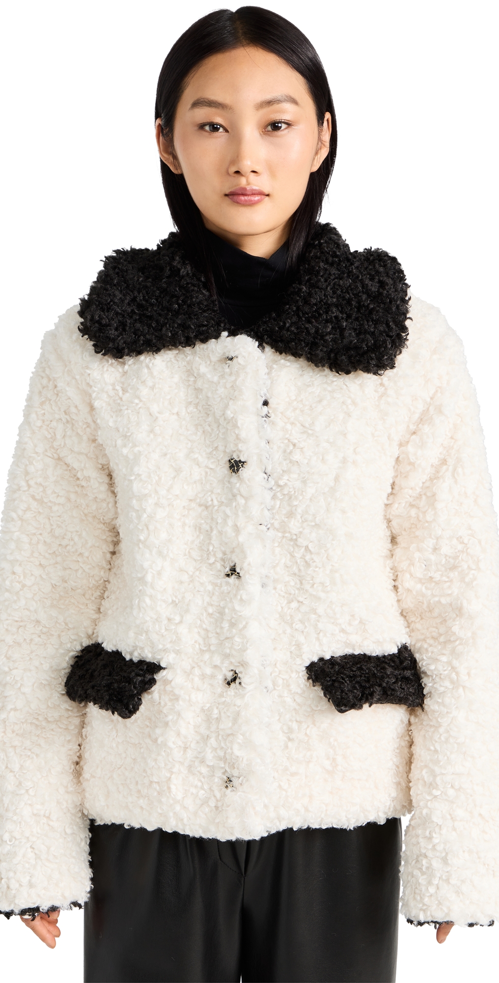 Fabric: Mid-weight non-stretch boucle. Collared neckline and long sleeves. Enamel heart-shaped buttons. Flap front pockets. Shell: 100% polyester. Lined. Hand wash. Imported, China. Measurements: Measurements from size S Length: 23.5in / 60.0cm, from shoulder