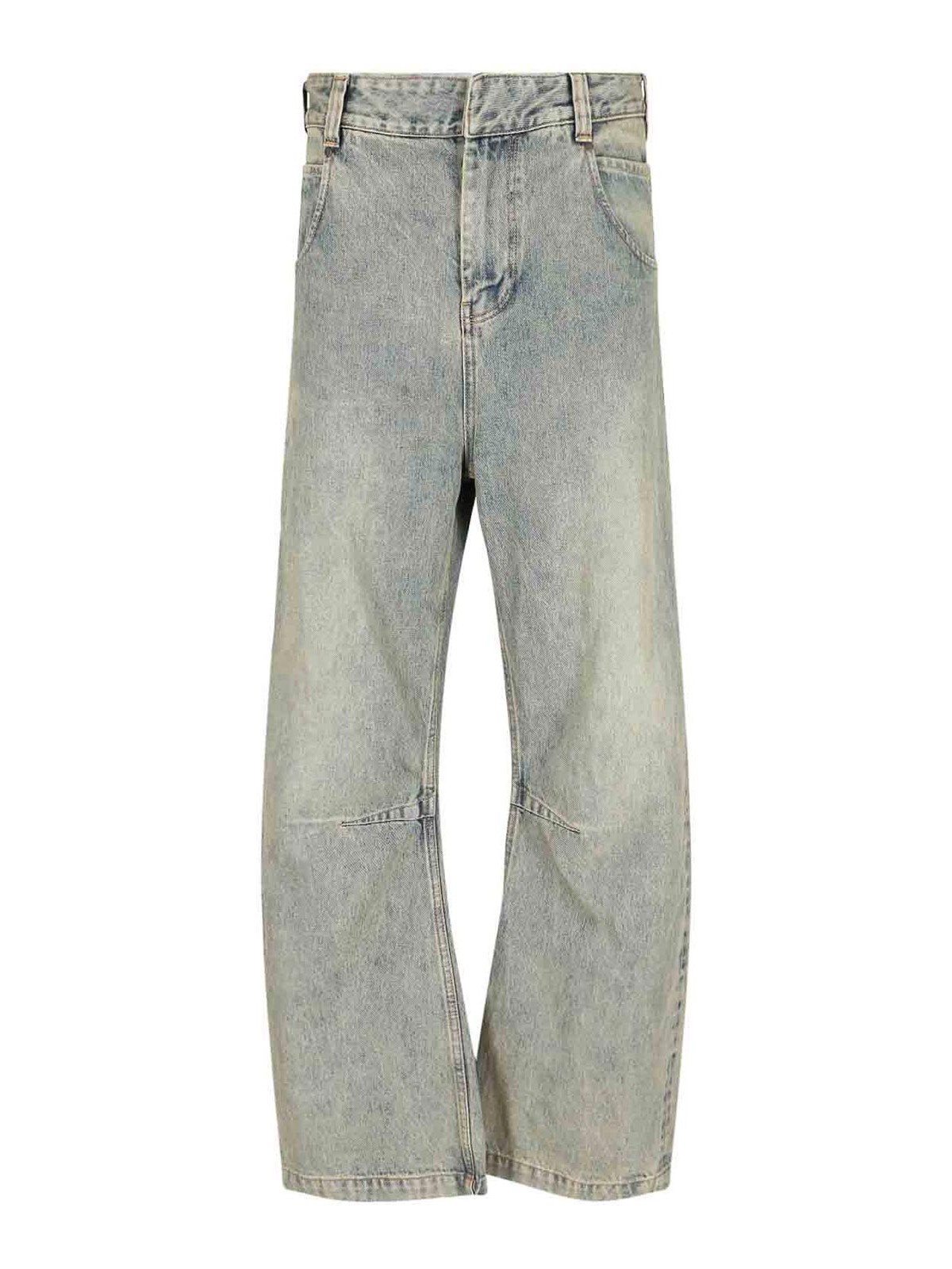 Jean large gamme Entire Studios, en denim bleu, délavé USURED, taille moyenne, passants à la ceinture, fermeture boutonnée et zippée, design à cinq poches, deux poches latérales boutonnées, écusson logo rétro, jambe large.