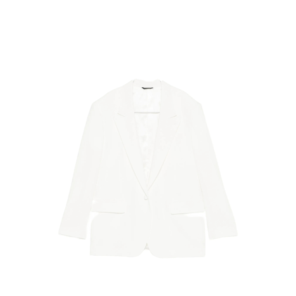 white button fastening peak lapels flap pockets long sleeves