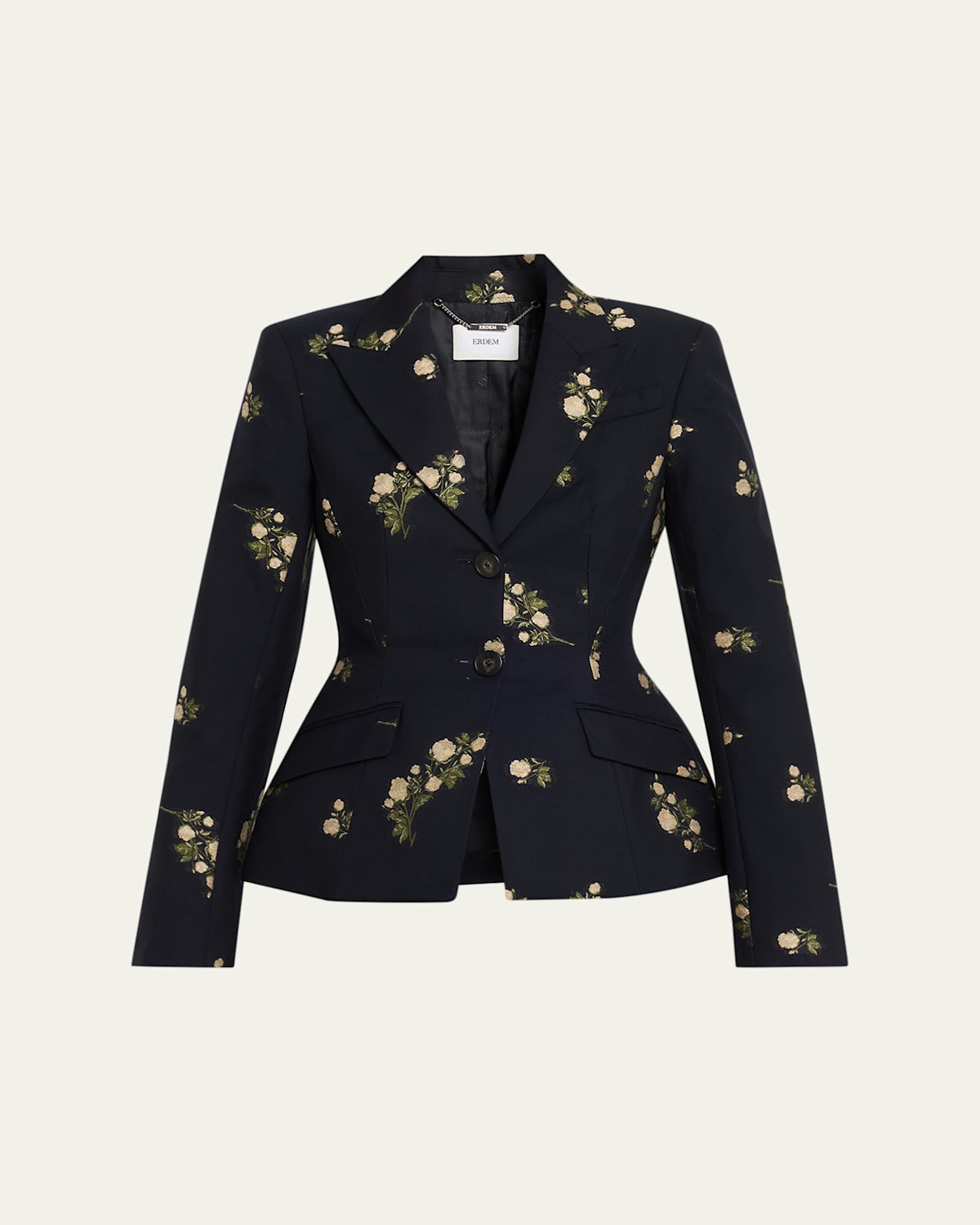 Erdem blazer jacket in a floral jacquard Peak lapels; singlebreasted front Long sleeves; button cuffs Padded shoulders Chest ewlt pocket Hip flap pockets Slim tailored fit Virgin wool/cotton/wool Lining: Cupro Do not iron, dry clean Made in Italy