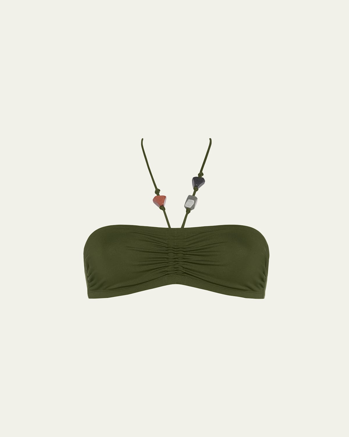 Eres "Polaris" bandeau bikini top decorated with stones Halter neckline; selfties behind the neck Front and side shirring Midback clasps Nylon/polyamide/spandex Made in Morocco Bottoms sold separately