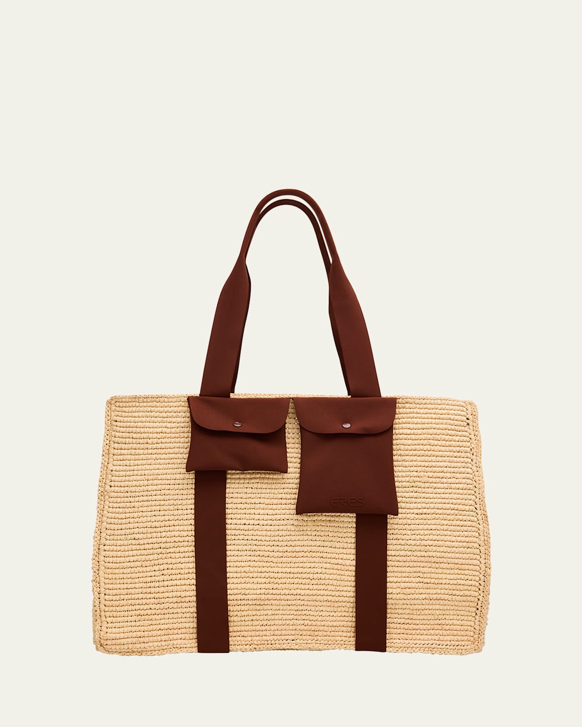 Eres beach basket tote bag in raffia with peau douce handles and functional pockets Flat top handles Exterior snapflap pockets Approx. 7.4"H x 9.8"L x 0.4"D Made in France