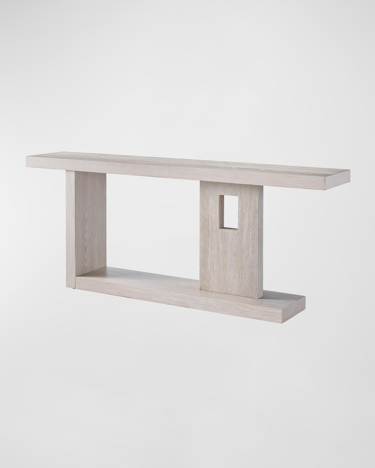 Clean, modern lines and a cantilevered top perfectly balance the playful and serene in this console piece. Handcrafted of engineered hardwood Overall, approx. 80"W x 15"D x 32"T Includes hardware Finished back Imported Weight, 108.0 lbs Boxed weight, approximately 123.0 lbs