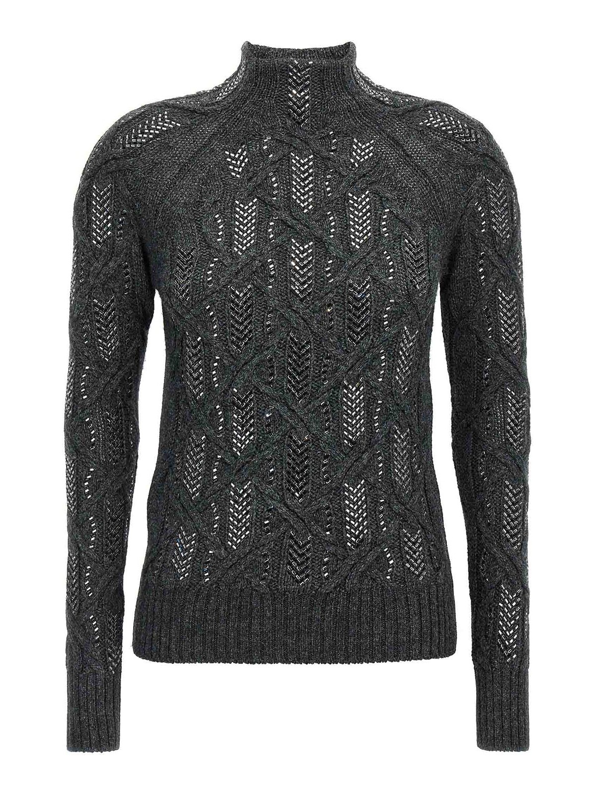 Pull en laine vierge mélangée à appliqués tressés, col haut et manches longues à revers
