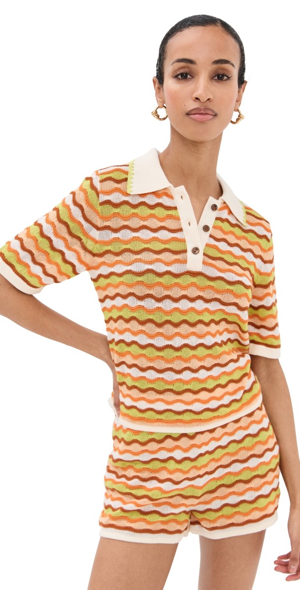 Fabric: Lightweight stretch knit. Wavy stripe pattern. Collared neck. Short sleeves. Partial button placket. Shell: 100% cotton. Dry clean. Imported, Peru. Measurements: Measurements from size XS Length: 19in / 48.0cm, from shoulder Rise: 12.25in / 31cm Inseam: 2.75in / 7cm
