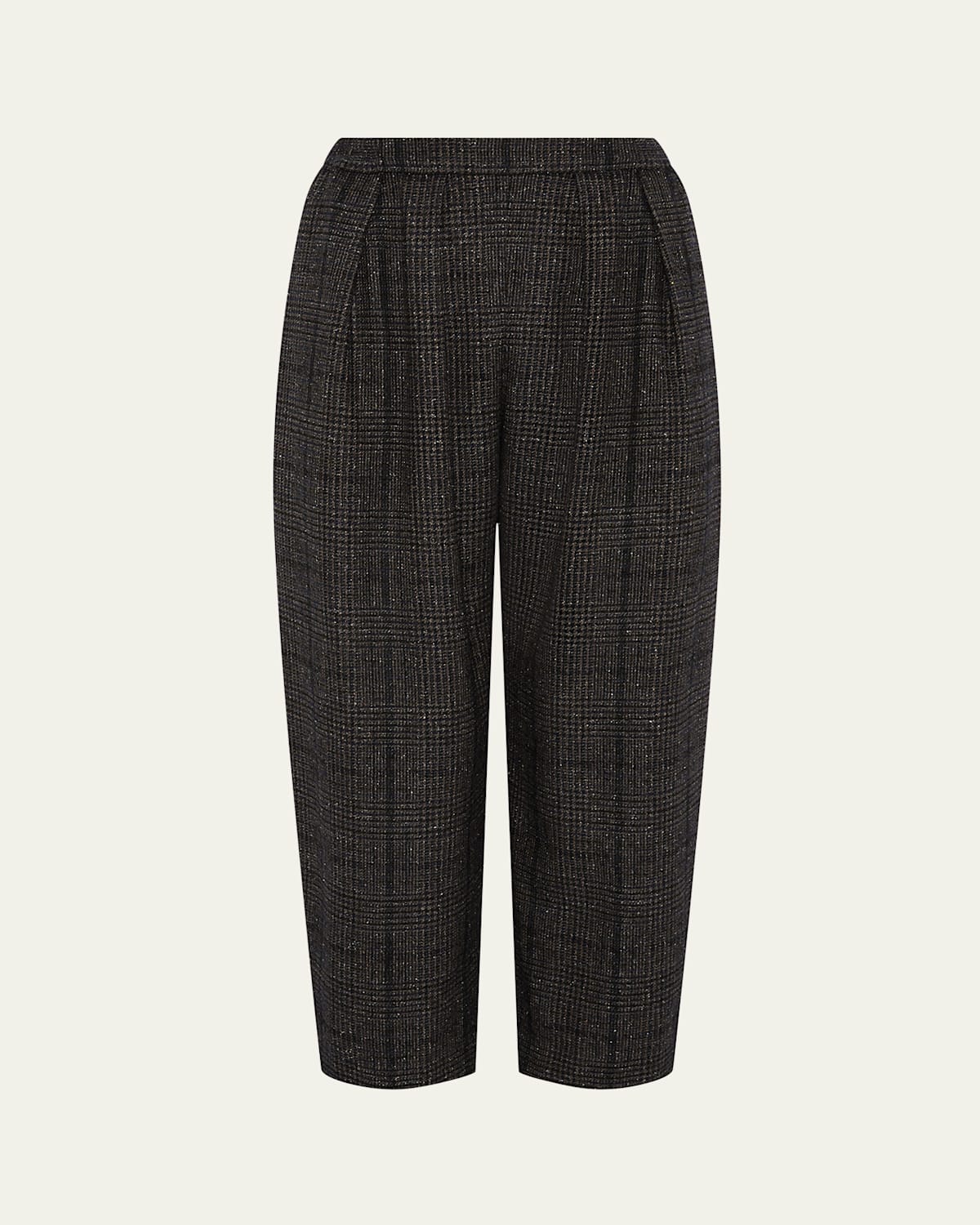 Eskandar trousers in textured basketweave plaid Mid rise sits high on hip Elasticized waistband Double pleated front Side split pockets Wide tapered legs Cropped length Pullon style Wool/silk Made in Poland