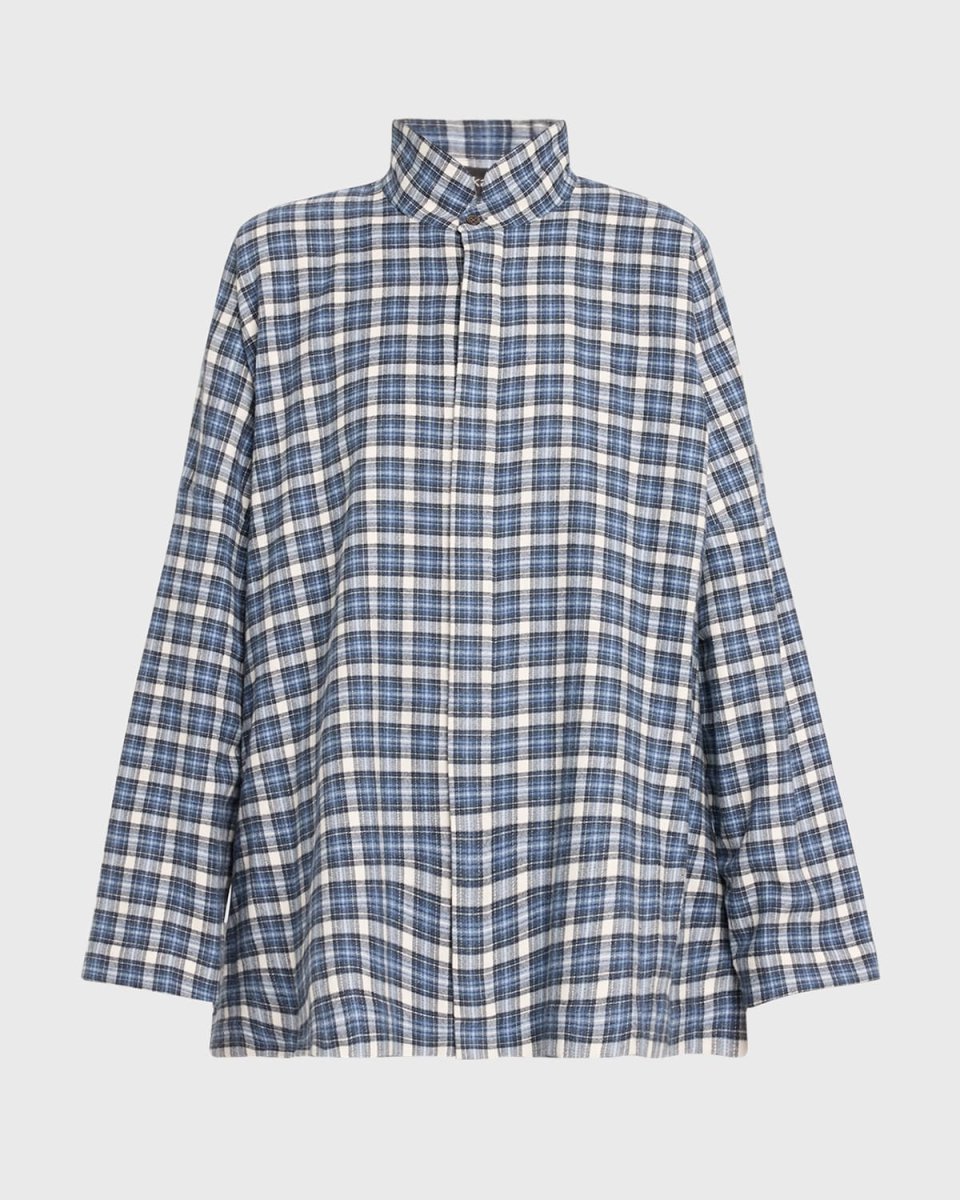 Eskandar plaid shirt Double stand collar; concealed button front Long sleeves; drop shoulders Wide longer back Mid plus length Cotton Unlined Dry clean, machine wash warm Made in Poland