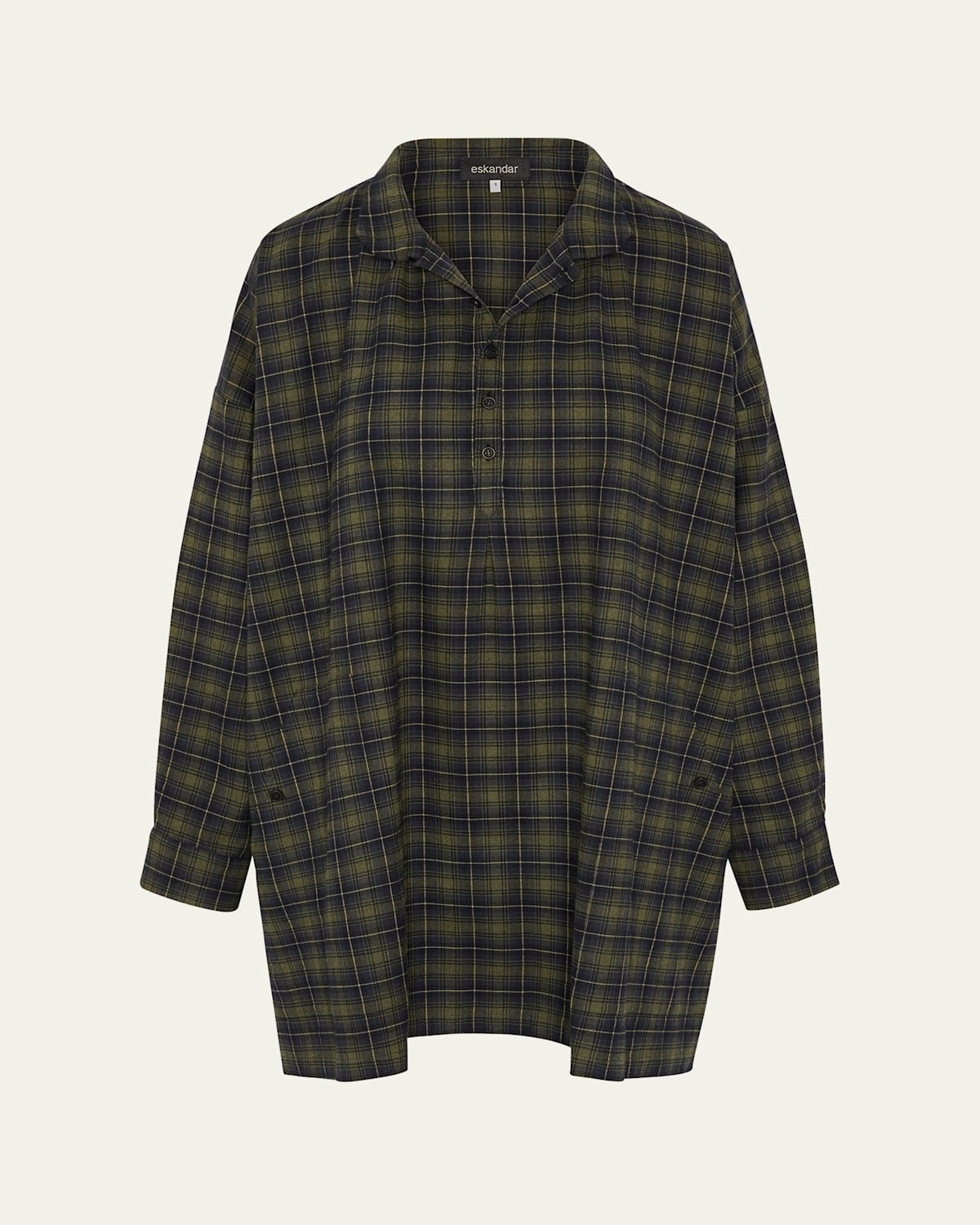 Eskandar artists smock in brushed cotton tartan Spread collar; button front Long sleeves; button cuffs Hip button patch pockets Wide Aline fit Long plus length Cotton Unlined Made in Poland
