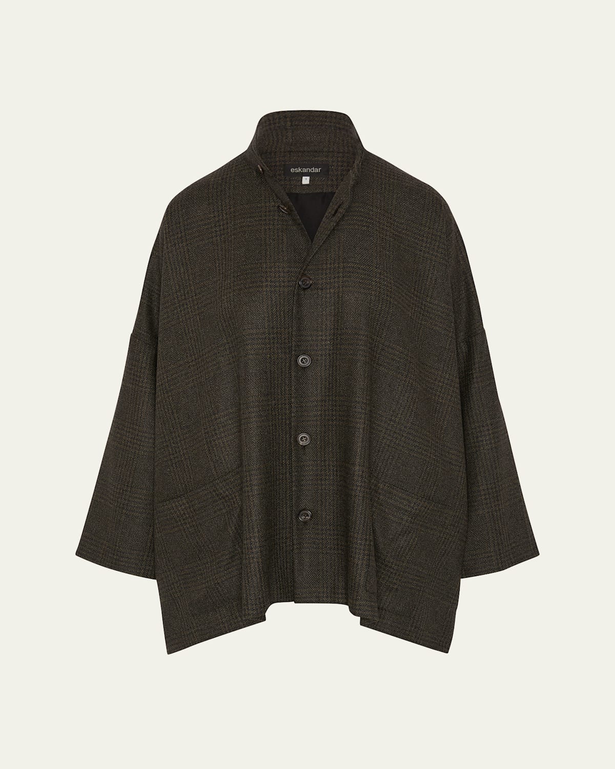 Eskandar jacket in houndstootch plaid Italian tweed Approx. 29.5"L from shoulder to hem Double stand collar; button front Long sleeves Hip patch pockets Eide fit Longer back Long length Wool Made in Poland