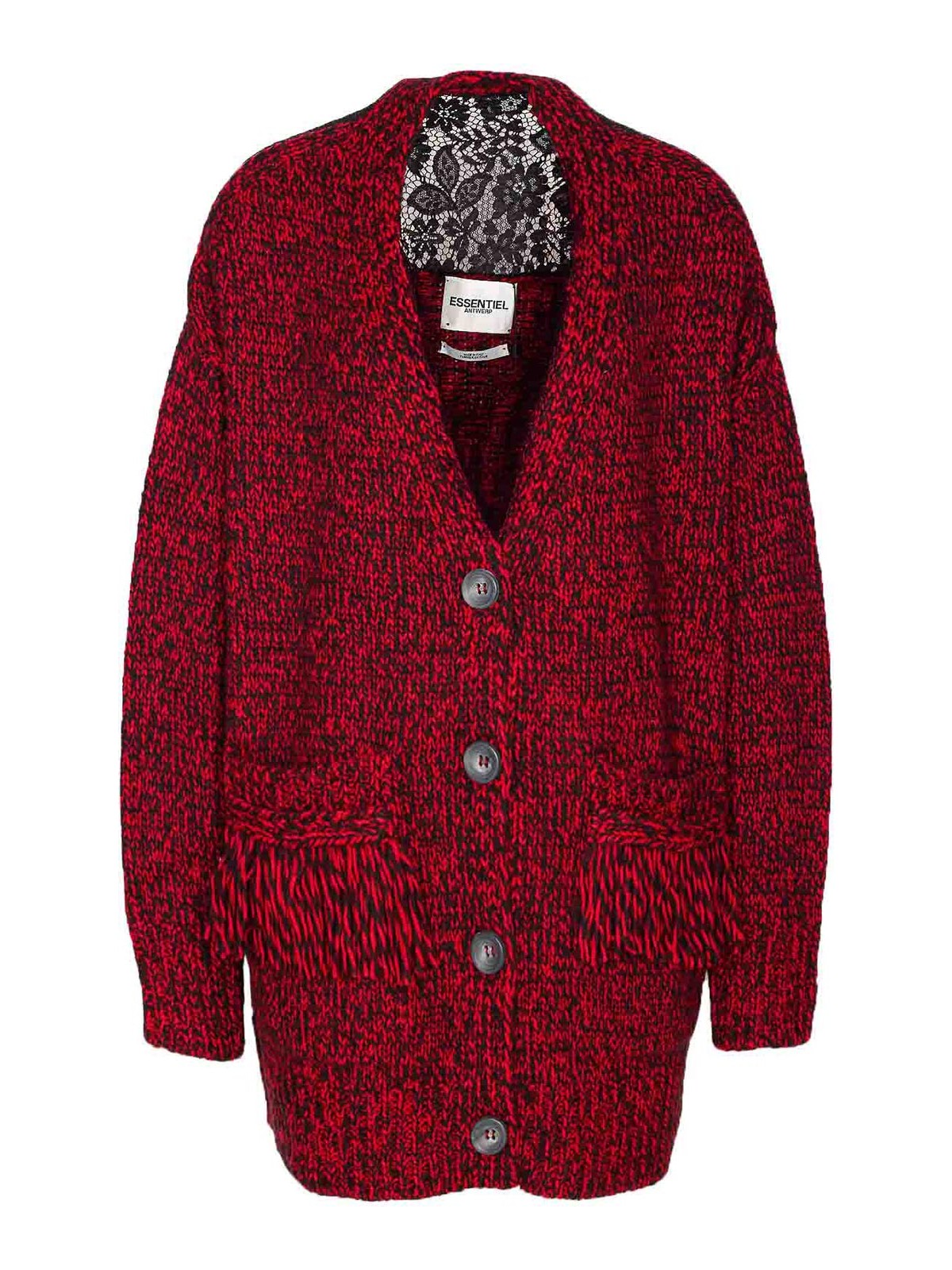 Cardigan rouge Essentiel Antwerp, col en V, boutons, poche frontale avec franges, dentelle au dos. Nom de la couleur du créateur: rouge