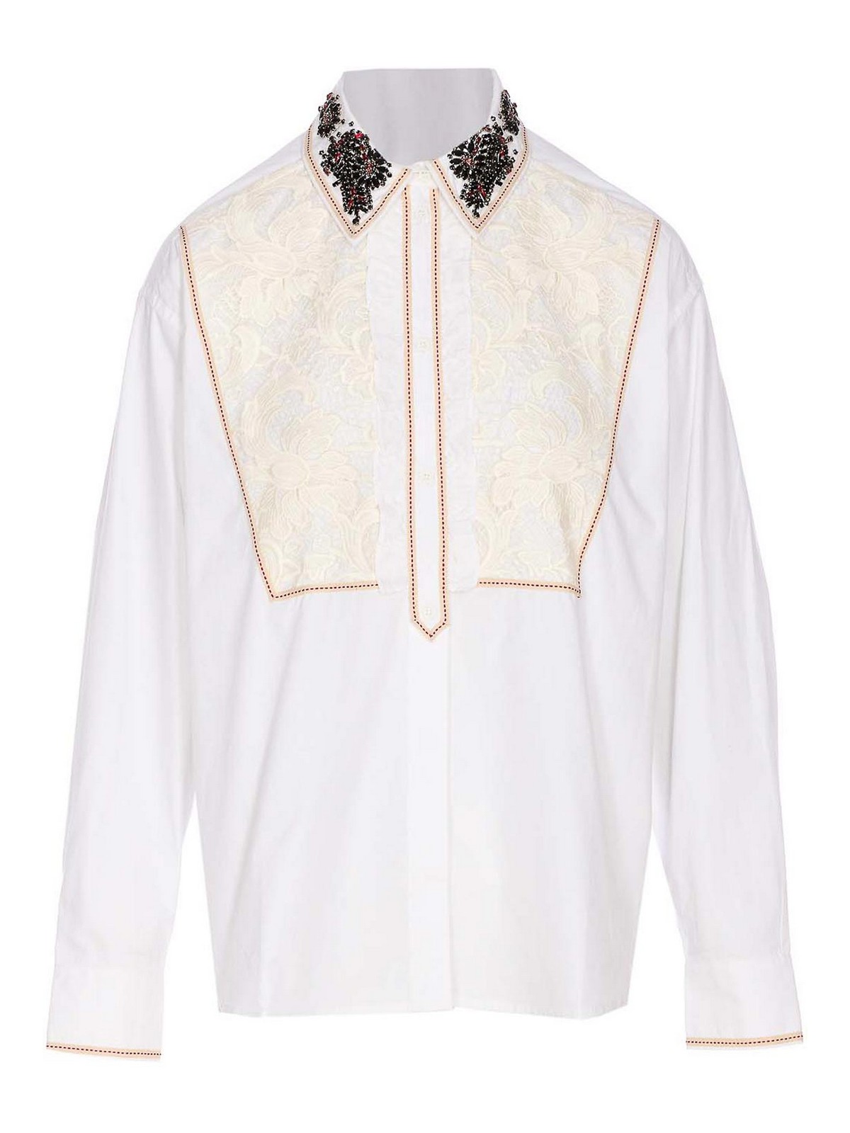 Chemise blanche Essentiel Antwerp longue avec poignets boutonnés, col classique avec application de diamants, dentelle frontale, nom de la couleur du créateur: blanc