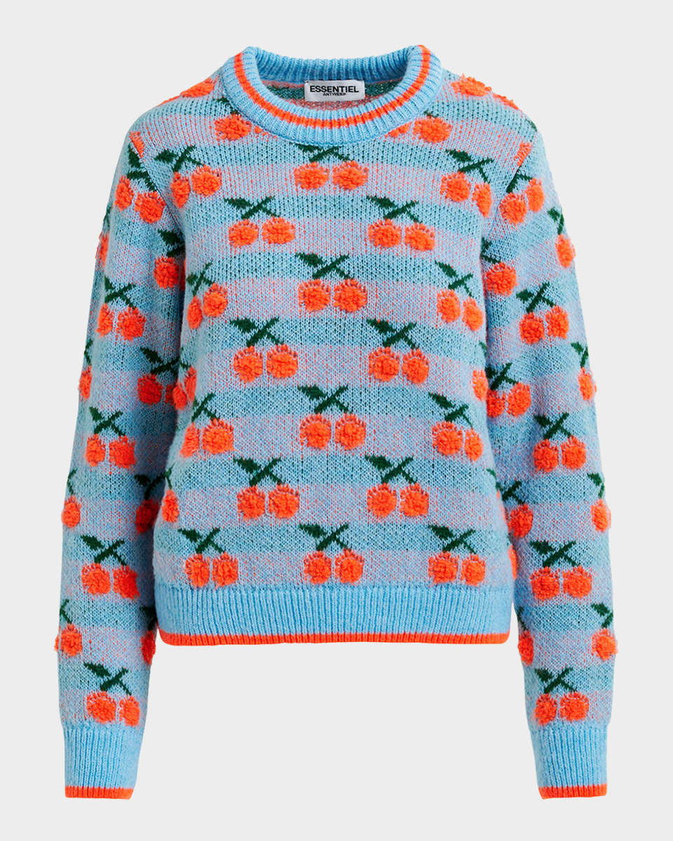 Essentiel Antwerp "Hiroyal" intarsiaknit sweater featuring a subtle striped pattern with cherries throughout Crew neckline Long sleeves Hip length Relaxed fit Ribbed cuffs and hem Pullover style Acrylic/nylon/polyamide/viscose Imported