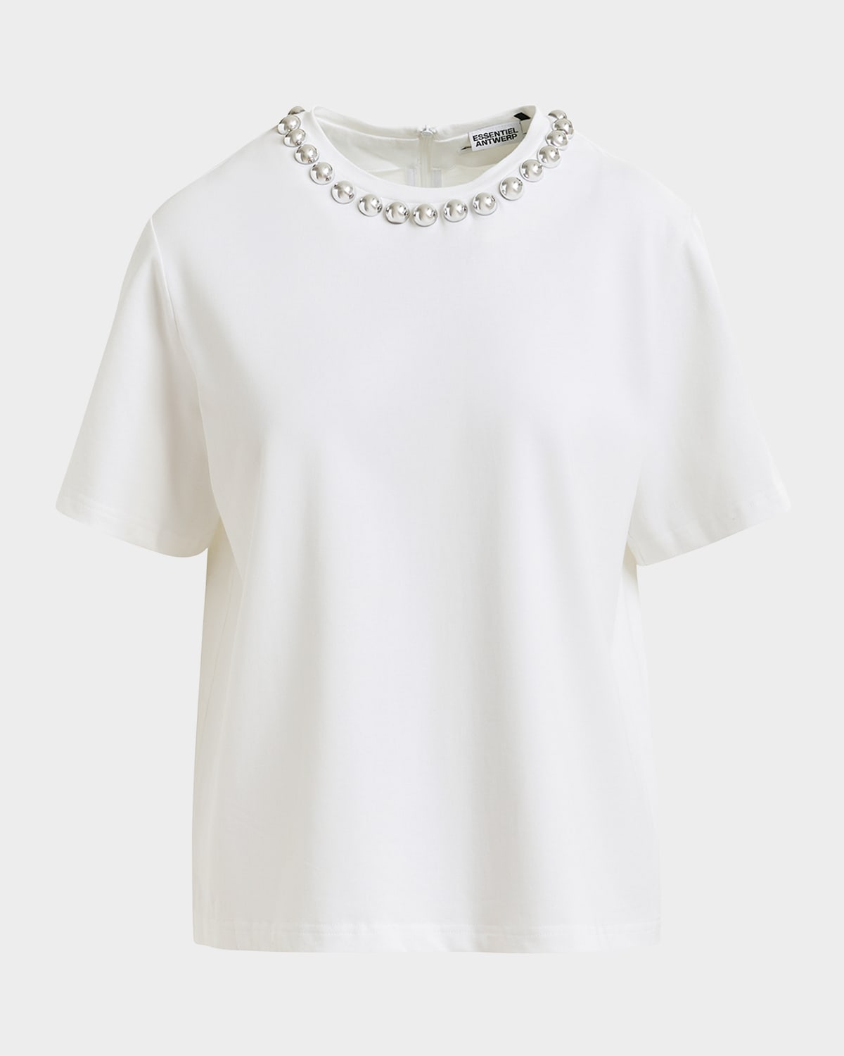 Silvertone dome embellishments outline the collar of the "Intenso" tshirt by Essentiel Antwerp for an elevated twist on a wardrobe staple Approx. 24"L from shoulder to hem Crew neckline Short sleeves; approx. 9.4"L Relaxed fit Hip length Hidden back zipper Cotton Imported