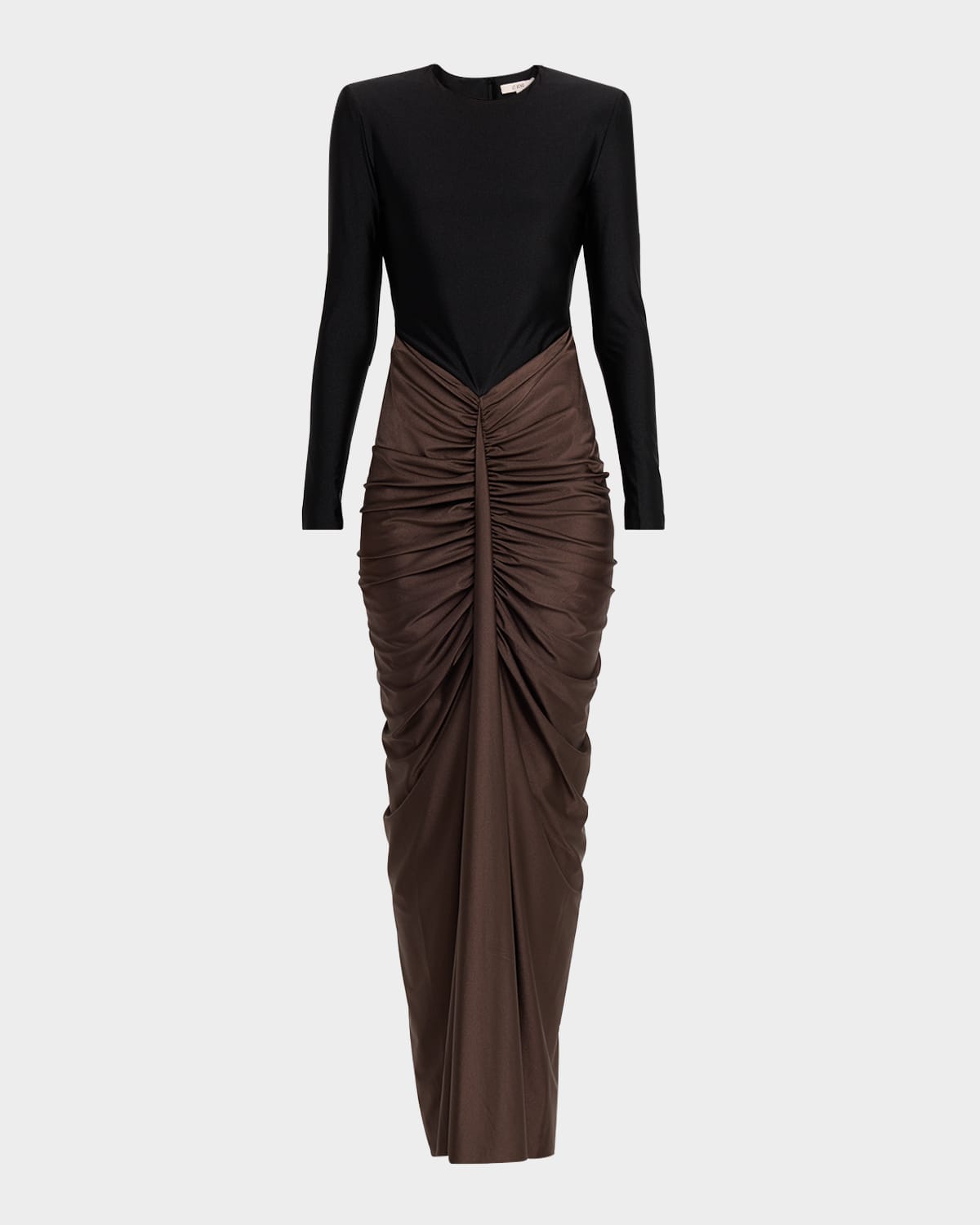 Sculpted and statuesque, this Et Ochs "Tate" gown is crafted in twotoned jersey, gathering in the front with ruching for a graceful drape Approx. 62"L from shoulders to hem Jewel neckline Padded shoulders Long sleeves Full length Column silhouette Invisible back zipper Nylon/polyamide/spandex Professional cleaning recommended Imported