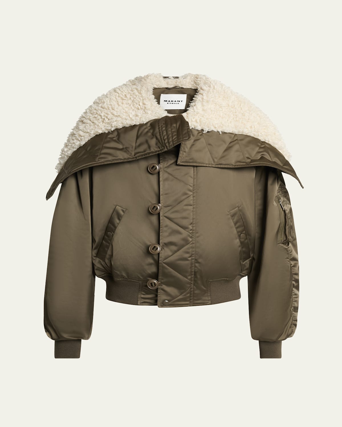 Etoile Isabel Marant "Elisa" sateen bomber jacket with faux fur (nylon) lining Hooded neckline with exposed zip Dropped shoulders Long ruched sleeves with ribknit cuffs Angled side pockets Relaxed fit Ribknit hem Zipfront with buttonplacket Nylon/polyamide Dry clean Imported