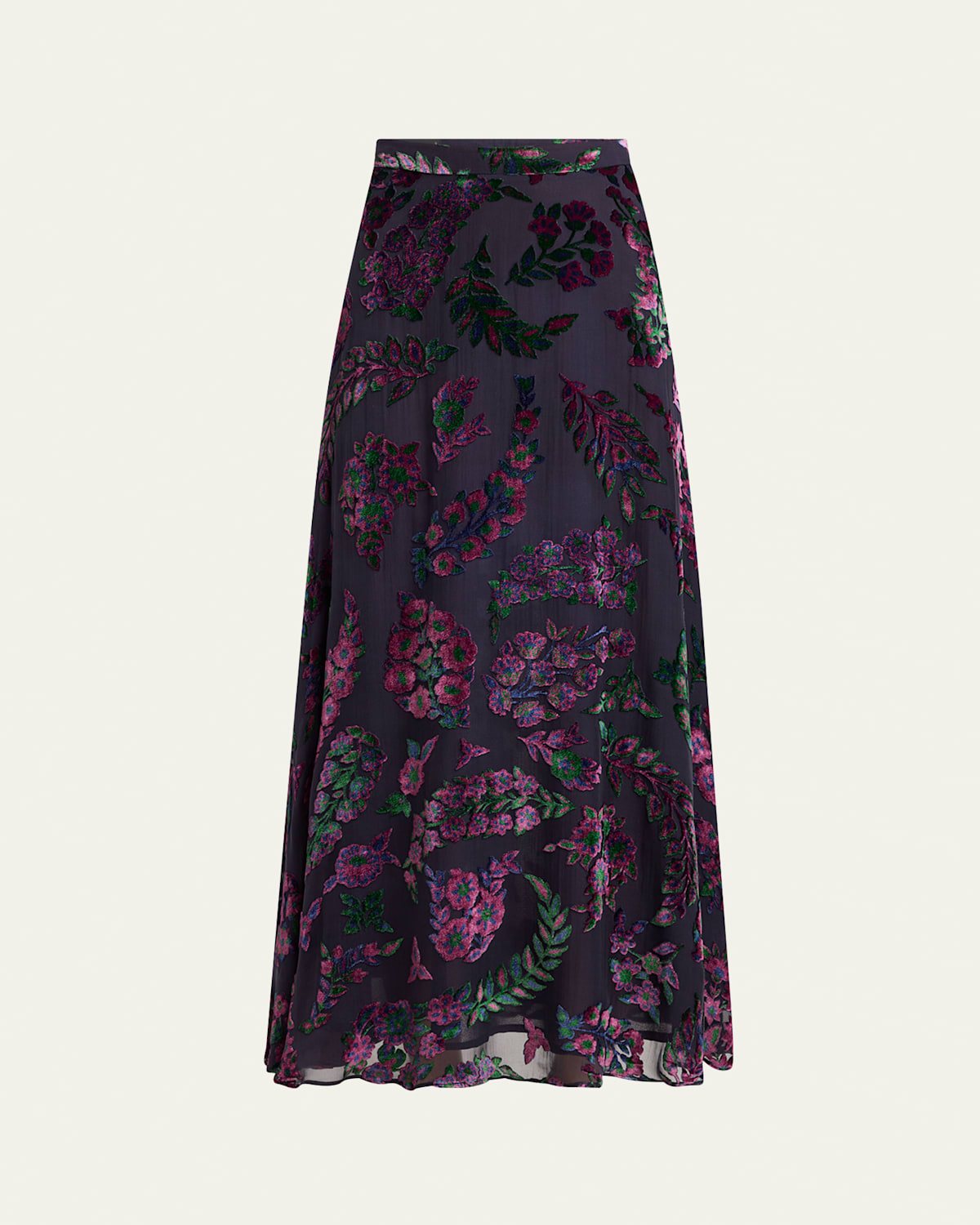 Etro velvet burnout maxi skirt High rise Aline silhouette Full length Center back zip Viscose/silk Professional cleaning recommended Made in Italy